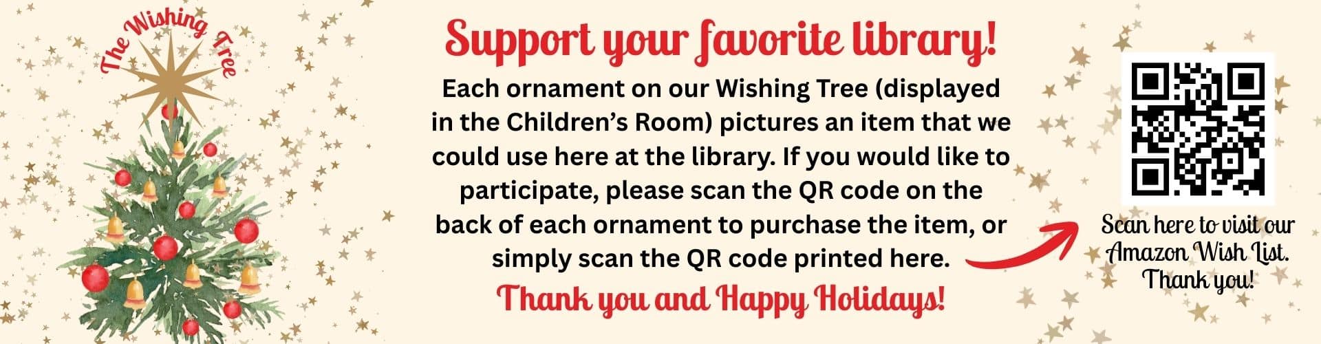 Each ornament on our wishing tree (displayed in the Children’s Room) pictures an item that we could use here at the library. If you would like to participate, please scan the QR code on the back of the ornament or click HERE.